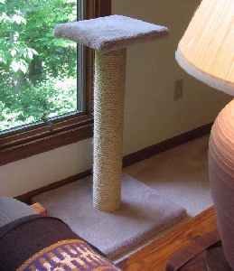 First of all, you need to know that I have produced sisal rope scratching posts for over 20 years – thousands of them. This is to establish the fact that I had better know by now the in’s and out’s of this! One thing I’ve learned is that people will go to a store displaying one of my works, and will conclude that they could make one of these pieces of cat furniture themselves, using readily available materials. In their mind (and I guess in yours, too!), it’s just a matter of getting a post, some rug and rope, a flat panel for the base, and VOILA! A sisal cat scratcher is born. I regard you cat lovers to be handy, resourceful, and patient. You CAN build cat furniture. Just know that you will invest several hours of your valuable time and the money for the materials you don’t have lying around the house. So take a moment and read a catman’s advice for how to make a cat scratcher, and save yourself a little time and aggravation.